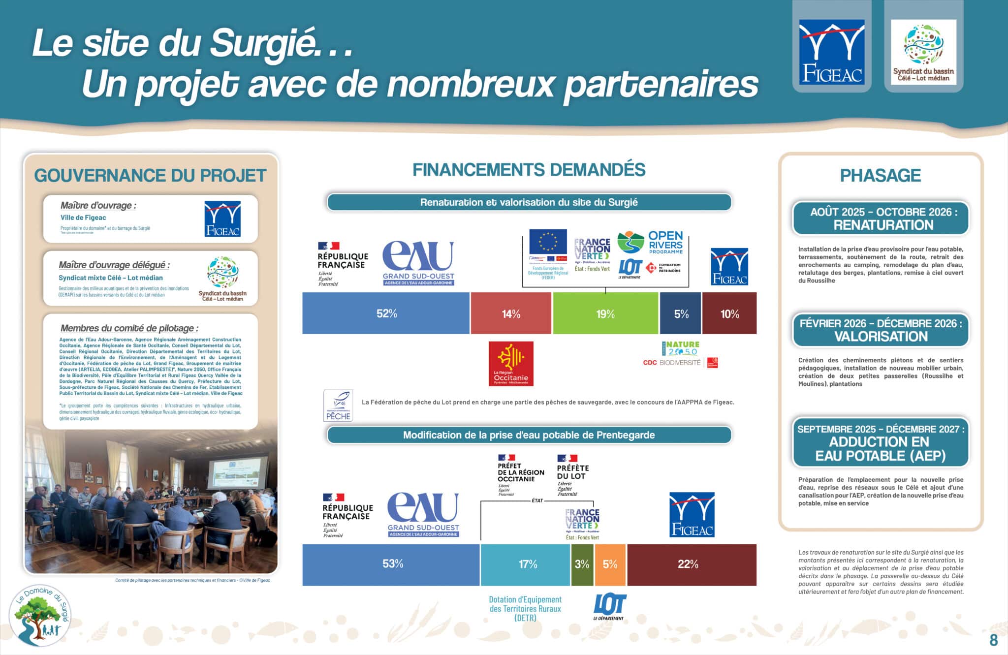 • les travaux de construction d’une nouvelle prise d’eau potable, rendus obligatoires par le faible niveau d’eau récurrent du Célé en été, estimés à 2,5 M €. La collectivité a fait le choix d’inclure ces travaux dans le projet du Surgié pour bénéficier des subventions.